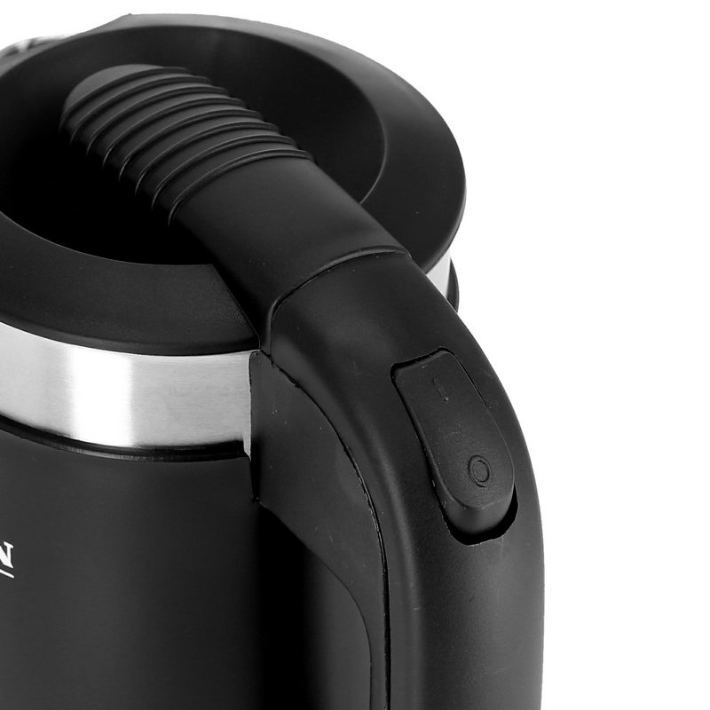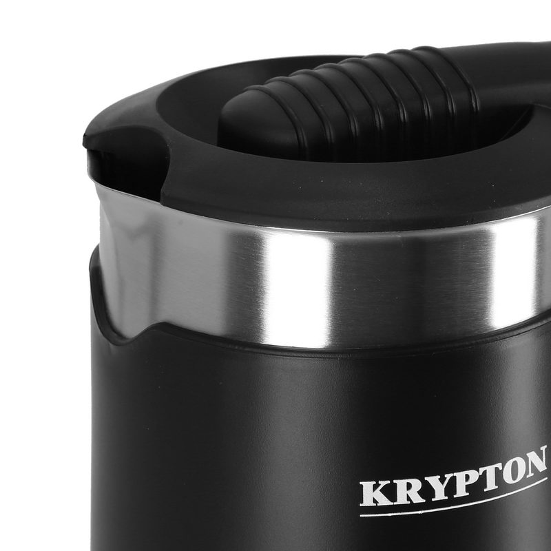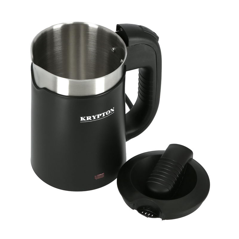 Krypton KNK6152 0.5L Electric Kettles comes will be comfortable for your kitchen with SS body, elegant handle, lengthy cord, automatic cut off and light indicator. It will quickly heats and lasts the heat of the water for a long. THERMOS FUNCTIONWater inside the kettle can keep its temperature longer, thanks to the double layer body. Double walls allow the kettle to heat up faster, thus saving time and energy. But despite the function of keeping the temperature, during operation, the water boiler does not heat up from outside more than 40 degrees outside due to two walls made of steel and high-quality plastic. This prevents unpleasant burns and makes it safe.EASY TO CLEANThis small kettle is very convenient to wash because the appliance lid is opened at 75 degrees and firmly fixed. This makes it easy to pour water inside and rinse it manually with water. In these models of kettles, you can also remove the filter and rinse it under running water. The closed heating element also prevents accumulation of scurf.STAINLESS STEEL DETAILSThe inner part of the black kettle, the lid and spout made of stainless steel. This makes these parts less vulnerable to damage. Also, the steel body of the smart kettle keeps the water temperature inside longer. The material is safe for water and ensures its cleanliness.FAST BOILINGWhen the filter kettle is completely filled with water, boiling will take no more than 5-6 minutes. The closed heating element greatly accelerates the operation of the device.