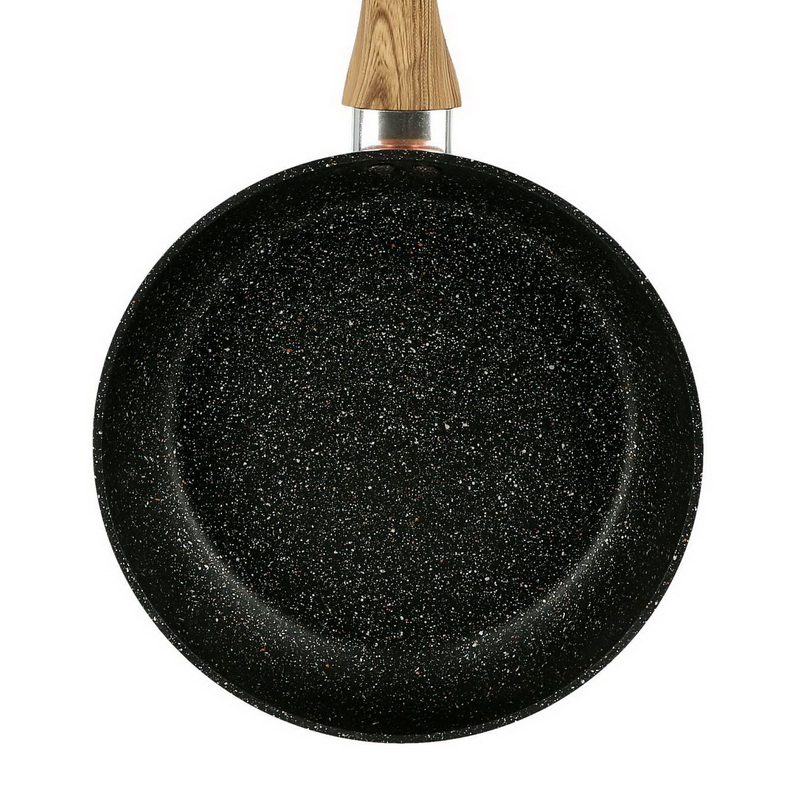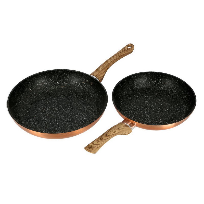 A healthy way of cooking Royalford 2 Pcs Frying pans is a healthy alternative to traditional frying pans which lets you enjoy beautiful cooked meats and vegetables. Improve your collection of pots and pans with this high quality, strong forged aluminium round-shaped frying pan; enjoy perfect cooked foods every time. Thanks to strong forged aluminium build finished with a revolutionary marble effect coating that is wonderfully non-stick with 3.8 MM Induction Base and copper exterior coating, so it heats up quickly and evenly so you get a consistent cooking surface with no hot spots. Food can be prepared in minimal oil for healthier meals for you and your family.Free from PFOA & PTFE, the pans are suitable for most hob types due to strong forged aluminium build. A universal induction base ensures the pan is compatible with all gas, induction and electric hobs. Make flavour-packed meals in minutes with this fast-heating, family-sized frying pan. When you've hungry mouths to feed, it'll make short work of your favourites. Look forward to tasty chicken stir-fries, hearty seared steaks, and - everyone's favourite - the classic cooked breakfast.The secret to its speed lies in the induction base and forged aluminium body, which spreads heat quickly and evenly. This means your favourite fried foods arrive on your table in a fraction of the normal cooking time. The tough, durable coating allows food to release from the pan with ease, too and makes it simple to clean. To make things easier, the pans are lightweight and feature a soft-touch wooden finish handles for ultimate comfort and safety with every use. The handle allows you to transfer the pan securely from hob to hob, or to the table, with ease. The pan looks clean & smart in your kitchen!
