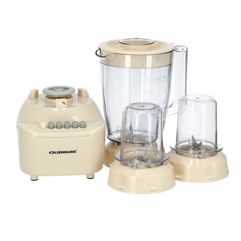 The Olsenmark 3-in-1 multi-functional blenders can mix, blend, puree, crush, chop, grind coffee, spices, nuts, mill, crush ice and soya bean milkshake, smoothies, vegetables, and these are not the last of its features from a whole list.In seconds you can create cool, smooth and great tasting drinks and smoothies containing all of the nutrients and vitamins of your favorite fruits and vegetables. Simply put fruits and vegetables and close the lid then press the button to blend your drink. Powerful 350W motor and specially designed stainless-steel blades, creating pulse, pause and blending patterns.The Olsenmark blender package includes 2 small grinder jars, along with juice jar which can be used for a variety of applications. The body is made of high-quality plastic making it ideal choice which will last for longer and adds durability to the device. Cleaning is a breeze, just rinse under the tap or place in your dishwasher and that's it, it's clean. Perfect ice crushing, blending, chopping, pureeing, juicing and controlled processing.