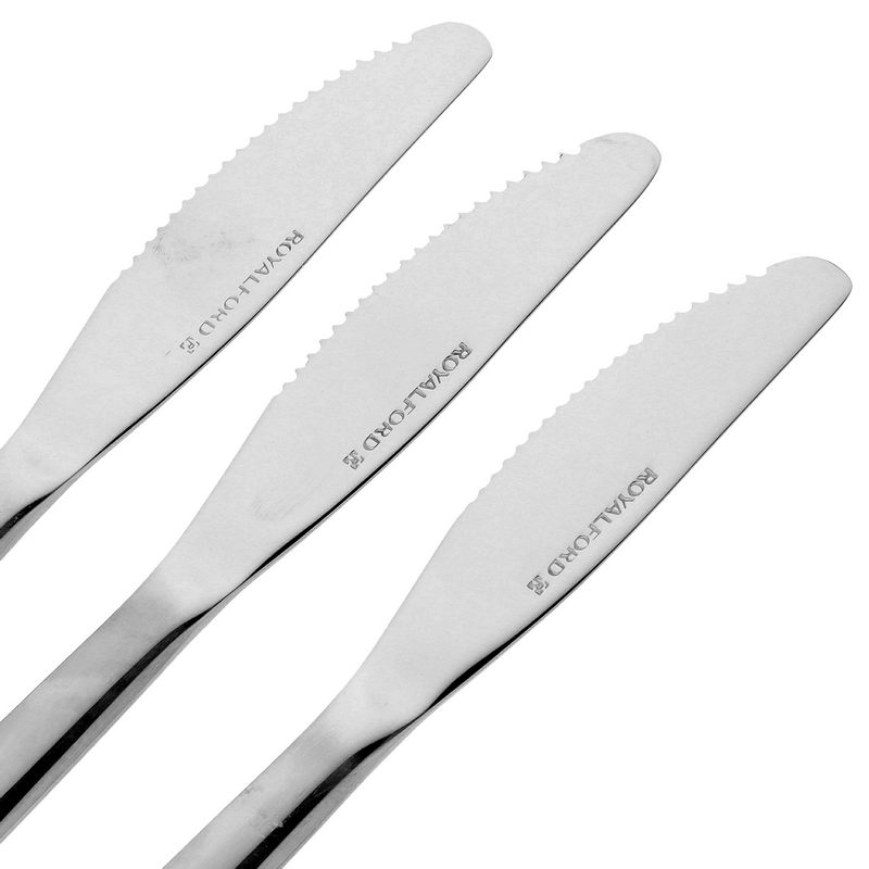 1. ROYALFORD 3 PCS KNIFE SET - This set of knives will add refined style to any well-set table with this 3-piece set of high-quality steak knives. Each steak knife combines classic good looks with high-quality performance.2. COMPLETES YOUR DINNER PARTIES - The 3-piece knife set makes it easy to slice into the pleasing flavour, whether it's baked pork chops hot out of the oven or sizzling steaks right off the grill.3. SHARP SERRATED KNIFE EDGE - These steak knives have a small, sharp, one-sided toothed cutting edge that never needs sharpening, ensuring effortless slicing and reliable, long-lasting performance. The zig-zag knife blades were made to perfection.4. SUPERIOR DESIGN - The steak knives come equipped with ergonomically designed handles to help ensure a secure, comfortable grip, keep fingers a safe distance from the blade.5. BROAD & SLIM HANDLE - The knife has a very slim and flat handle which makes it very easy to use while cutting the meat and other items without slipping from hands.