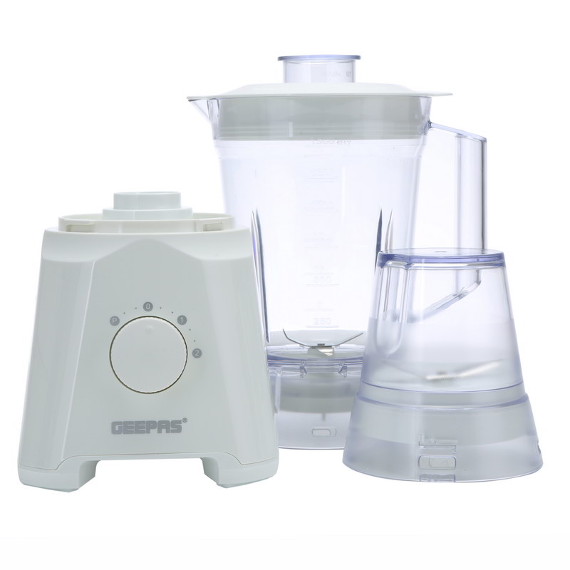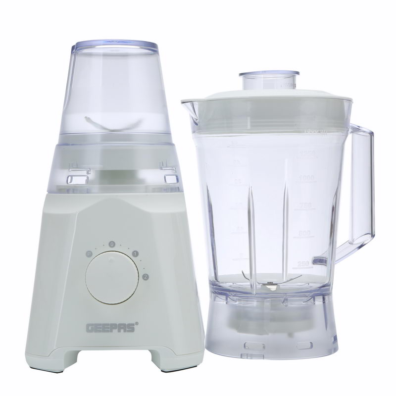 Nowadays it is impossible to imagine any kitchen without a blender. It accelerates and simplifies what previously required so much effort and time. The Geepas 2-in-1 multifunctional blenders can mix, grind coffee, spices, nuts, mill, crush ice and soya bean milkshake, smoothies, vegetables, fresh juices and these are not the last of its features from a whole list.In seconds you can create cool, smooth and great tasting drinks and smoothies containing all of the nutrients and vitamins of your favorite fruits and vegetables. Simply put fruits and vegetables and close the lid then press the button to blend your drink. Powerful 500W motor and specially designed stainless steel blades, creating pulse, pause and blending patterns. Extracting all of the nutrients you put in, leaving no item unblended, even ice. There's no waste, getting out 100% of the valuable nutrition that you put in. Leaving you with consistently smooth, cool, delicious nutrient-vitamin drinks juices and smoothies to enjoy. Making blending fast and simple, the Geepas active blender is ideal for the health conscious to make homemade sports nutrition and protein shakes. With a small, but powerful blender you can make delicious iced-juice slushies, extra thick smoothies and breakfast drinks.Juicing removes most of the liquid from fruits and vegetables and the vitamins in fruits and vegetables, such as vitamin C and vitamin A, are absorbed better in liquid form. Your body can bypass unnecessary digestion of fiber and then more quickly and efficiently absorb nutrients. Besides, it is the best choices for Body Detoxification, Weight Loss, and Alternative for Diets Lacking Fruits and Vegetables. The drink blender package includes 200ml grinder jar, one for chopping and grinding along with juice jar which can be used for a variety of applications.