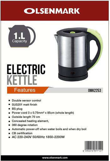The Olsenmark Electric Stainless-Steel Kettle provides you with a stylish design Textured Kettle combining a high glossy Stainless-Steel material for a rich feel meaning it will bring style to any kitchen work top. Kettles and toasters form the perfect morning brunch. The large, 1 litre capacity means you'll have plenty of hot water for any large family or team or work colleagues. Filling the large kettle is also easy thanks to the flip top lid that opens through 90 degrees. It is a 2200w, kettle that boils quickly and quietly, even when it is at full capacity.The base makes sure it's sturdy enough to last long. The whole kettle was made by safety materials making it Stylish and practical. To help keep your kitchen clean, the spout has been designed for easy accurate pouring. Almost everyone has had those moments when you put up water or some other liquid for boiling and then forget to take it off. Then you smell something burning only to find the liquid dried up and the poor pot burning. With boil dry function in case all the water is dried up, the appliance will automatically shut down hence saving whatever was inside the kettle as well as the kettle itself.