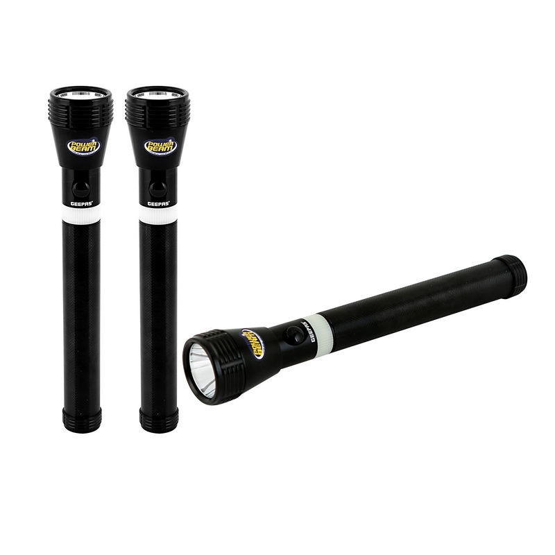 1. HIGH INTENSITY LIGHT LED FLASHLIGHT - This Geepas family set Led Torch has a high intensity light with led flash light gives bright white light which is less isn't harsh to eyes and this torch is very much useful in emergency light in case of power failures at your home.2. HIGHLY DURABLE ALUMINIUM BODY & WATER RESISTANT-Built up with the durable extra hard anodized-aluminium body which is water proof, anti-skid, shock resistant and sustains even by rough handling.3. RECHARGEABLE & 2000 METERS REAL RANGE DISTANCE-This torch has an immense wavelength and is capable to reach a long distance with maximum range of 2000 meters. Comes with highly durable rechargeable battery can work for 4 hours at single charge.4. WHITE MICRO CHIP LED, 4 HOURS AT SINGLE CHARGE-This torch will provide you bright white light up to 4 hours at single charge & as you fix the distance of the light beam it automatically provide you the bright light needed to that distance to give you clear view.