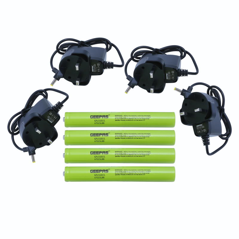 1. RECHARGEABLE BATTERY, 1900 MAH - You can charge battery multiple times as and when needed which avoid of changing battery as compared to other torches. Save your money & time by using geepas torch. Huge battery provides 2 hours of continuous working in a single charge. It takes 7 hours to get fully charged.2. SWITCH MODE ON/OFF, RED TO GREEN ADAPTOR INDICATORS - Just click on button to start or stop the working of your torch and it comes with light indication at the adaptor while charging just to ensure the charging status. Turns green while it is fully charged and ready to use.3. LIFE TIME WARRANTY FOR CREE LED - Highly durable led is capable to provide high intensity light with less energy consumption ensuring a life time warranty.4. HIGHLY DURABLE ALUMINIUM BODY, WATER PROOF & RELIABLE - Housing grade aluminium alloy is anti-abrasive, drop-resistance and waterproof tactical flashlight. Much more durable. It can work in 0.5-meter water depth up to 30 minutes.5. PORTABLE, COMPACT DESIGN - This pack of 4 torch are slim and sleek very easy to carry takes less place and fits easily in your pockets and bags to enjoy individuals clear and bright road while outings with your family or friends