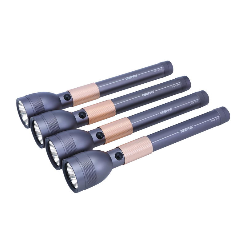 Geepas 4 In 1 Rechargeable Waterproof Family Pack LED Flashlight 1900 mAh - 330 Lumens Super bright Light Rechargeable Flashlight| Aluminium Body, Water Proof, Highly durable CREE LED Lights