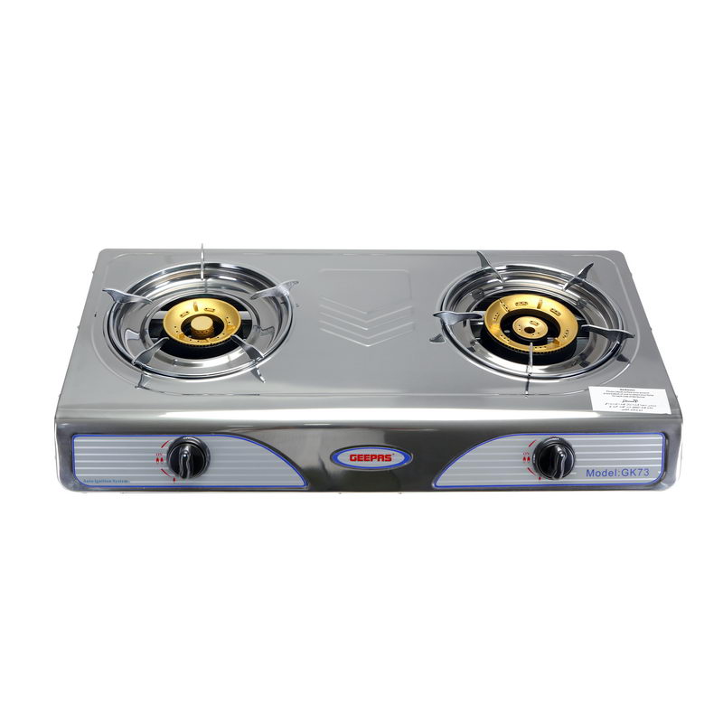Hey! Let's Cook Up Some Warm Moments TogetherGeepas Stainless Steel 2 Burner Gas Stove - Modernize your kitchen space with this 2 burner gas stove and Embrace a stylish design along with safety features. Eases your everyday cooking efficiently and comes in a stainless steel finish body to make your kitchen spacious and appealing. You can easily place this over your kitchen counter without taking much of space and the burners of the gas stove ensure even heat distribution for an excellent cooking at low gas consumption.Double Stainless-Steel Gas Stove Indoor Cooktop - The powerful burners provide basis for efficient and effective cooking, Complete with high-quality stainless-steel surface that requires little maintenance and has an incredibly long life.Energy Efficient Cooktops - Stainless steel body with 2 heavy brass burners, for effective and even heat distribution.Compact Design - Its compact design makes it the perfect fit for your kitchen by occupying less space and adding more utility.Easy to Clean, Easy to Use -The innovative Stainless-steel drip trays are designed for easy cleaning and maintenance that gathers spills and overflows while keeping the cooktop clean. With automatic ignition you are able to get heat instantly.FeaturesGas Stoves are made from high quality stainless steel which are easy to maintain and long lasting.Unique body shape makes it user friendly and easy to clean.Comes with highly efficient burners which consumes less energy.The knobs are fitted in a way to last longer and ease of operation.