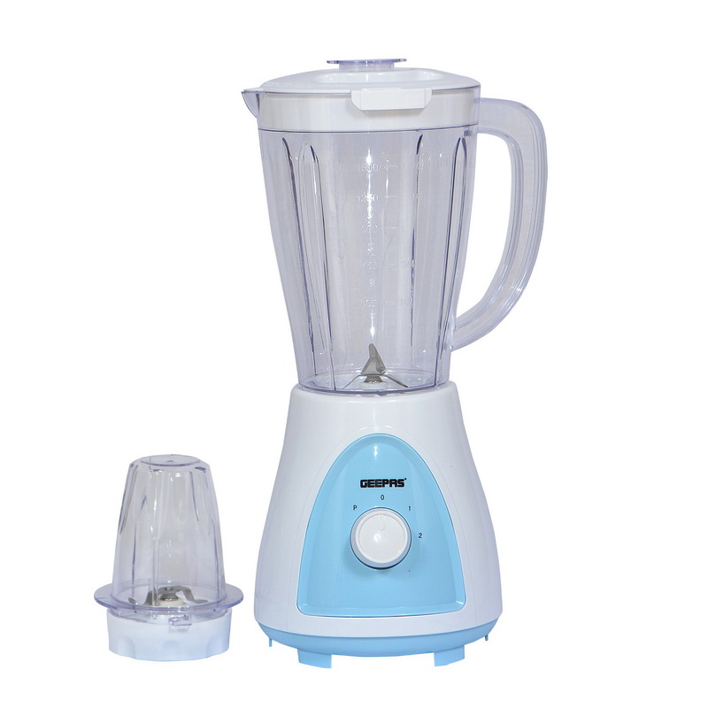1. GEEPAS 400W 2IN1 MULTI-FUNCTIONAL BLENDER - The 400W power of this 2 in 1 multi-functional blender allows you to cope with hard fruits & vegetables, ideal for creating quick, easy, nutritious drinks and smoothies on the go - simply load, blend and go!2. 2 SPEED KNOB CONTROL WITH PULSE -Keep control over your blending & juicing creations with the dual speed functions. And with "Pulse" function grind the ice to the smallest grains & gives option to use full blade speed in bursts.3. STAINLESS STEEL CUTTING BLADES - With this long span blades made of stainless steel, you can cut all kinds of fruits and vegetables, & grind coffee to its finest. Perfect for ice crushing, blending, pureeing, juicing, mixing and controlled processing.4. 1.5 L TRANSPARENT PLASTIC JAR, 100g COFFEE GRINDER - With a jar this big and transparent you can blend huge amounts of fruits, vegetables, & even ice; The grinder mill is ideal for coffee spice & nuts grinding. It helps to save time on cutting fruits or vegetables & instantly get a class of taste & healthy juice within a few seconds.5. SAFETY LOCK, LOW NOISE - This Geepas grinder protected with safe lock to prevent the damage and get it on when not in use. It has very low noise of its copper motor.
