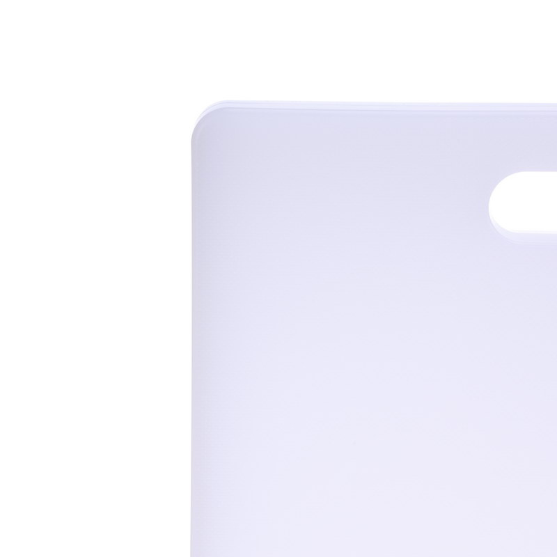 Perfect for everyday cooking, this fantastic chopping board ensures you always have adequate chopping space when you're cooking up a storm. Use both sides to chop different foods safely and hygienically - great for all types of food including meat, fish, fruit, vegetables, bread cheese and more.Constructed from food-grade polypropylene plastic, this Royalford cutting board is well equipped to withstand the demands of the busy kitchen. It also helps to protect your knives against dulling too, keeping them sharper for longer. Comes with non-slip base to secure the board in place while you work, offering extra safety and security; Includes antimicrobial protection with built-in defense properties that inhibit the growth of stain and odor-causing bacteria.This durable board has a rigid construction, and won't twist or flex. Once service is over, cleaning and care of this worktop saver couldn't be simpler - simply pop in your dishwasher or wipe down with a non-abrasive sponge to preserve their use for years to come! The small hole in the corner makes them ideal for hanging in a convenient place but can just as easily be stored in a cupboard.