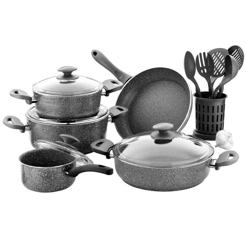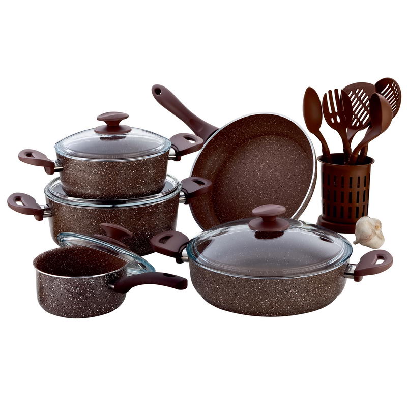 Royalford 15 PCs Cookware Set with Spoons & Holder A healthy way of cooking Royalford Smart Casserole Dish is a healthy alternative to traditional pots which lets you enjoy beautiful cooked meats and vegetables.1. NON-STICK STYLISH SAUCEPAN FOR ULTRA COOKING PERFORMANCE - Enhance your kitchen with the Royalford Casserole Dish, featuring unique non-stick professional-quality cookware designed for optimum cooking performance at home. Enjoy meals without food sticking to the pan during cooking. With less oil or residue, they are delightfully easy to clean which is ideal for active cooks and busy kitchens.2. IDEAL FOR HEALTHY COOKING - Requiring little to no oil thanks to its non-stick coating, this saucepan is ideal for creating healthy, low-oil alternatives to a variety of meals.3. TEMPERED GLASS LID - A close-fitting, toughened-glass lid lets you seal heat, juices, flavours, and nutrients inside the pan while still keeping an eye on your food and ensure no messy spills and gives complete cooking convenience.4. LIGHTWEIGHT - Build up with lightweight material when considerate to other materials, heats evenly, and is extremely durable. It is build up with 3 layers which will is long-lasting.5. SUPERIOR NON-STICK PERFORMANCE - 3-layer coating is durable, scratch-resistant, and offers incredible non-stick performance. it consumes less oil while cooking and prepares healthier food all the time.6. NO PFOA/PTFE - With safety for your family in mind, the saucepan is made with PTFE and PFOA free high-quality granite construction.