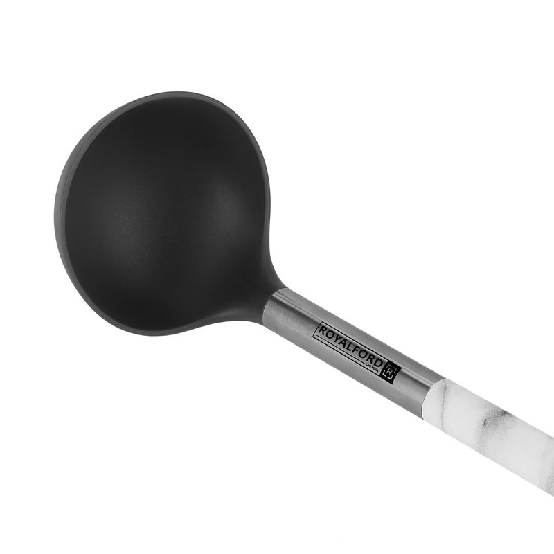 This cooking ladle is ideal for hundreds of cooking tasks - from stirring to scooping, mixing, serving, etc. It's heat-resistant, so you can safely use it in hot pots and pans without having to worry about it melting. And with its sturdy ABS handle, you always have total control whatever you're cooking.SAFE TO USE - Its gentle on the stainless steel surface. No nicks, no scuffs, and no scratches!COMFORTABLE MARBLE DESIGNED HANDLE - The spoon boasts an ergonomic marble designed handle. This makes stirring & serving much more comfortable. And with its soft-touch design, it's really easy to maintain a secure hold as your stir, scoop or serve. With its long handle, you can reach right to the bottom of your deep stockpots & mixing bowls. This way not a drop of sauce, batter or soup has to go to waste.STAIN AND ODOUR-RESISTANT - Thanks to its heavy-duty stainless steel design, this spoon won't discolour or absorb odours. This makes it ideal when you're cooking with strong or colourful ingredients.DURABLE AND HEAT SAFE -This Ladle Spoon is made of sturdy, heat-resistant nylon, so it's great for stirring hot pans of soup or scooping up servings of sauce. It's heat safe, so you don't have to worry about it melting.EASY TO STORE AWAY - Its stainless steel material with marble designed handle features a built-in hanging loop. This means you can simply hang it up on a kitchen hook or a utensils rack once you've finished.